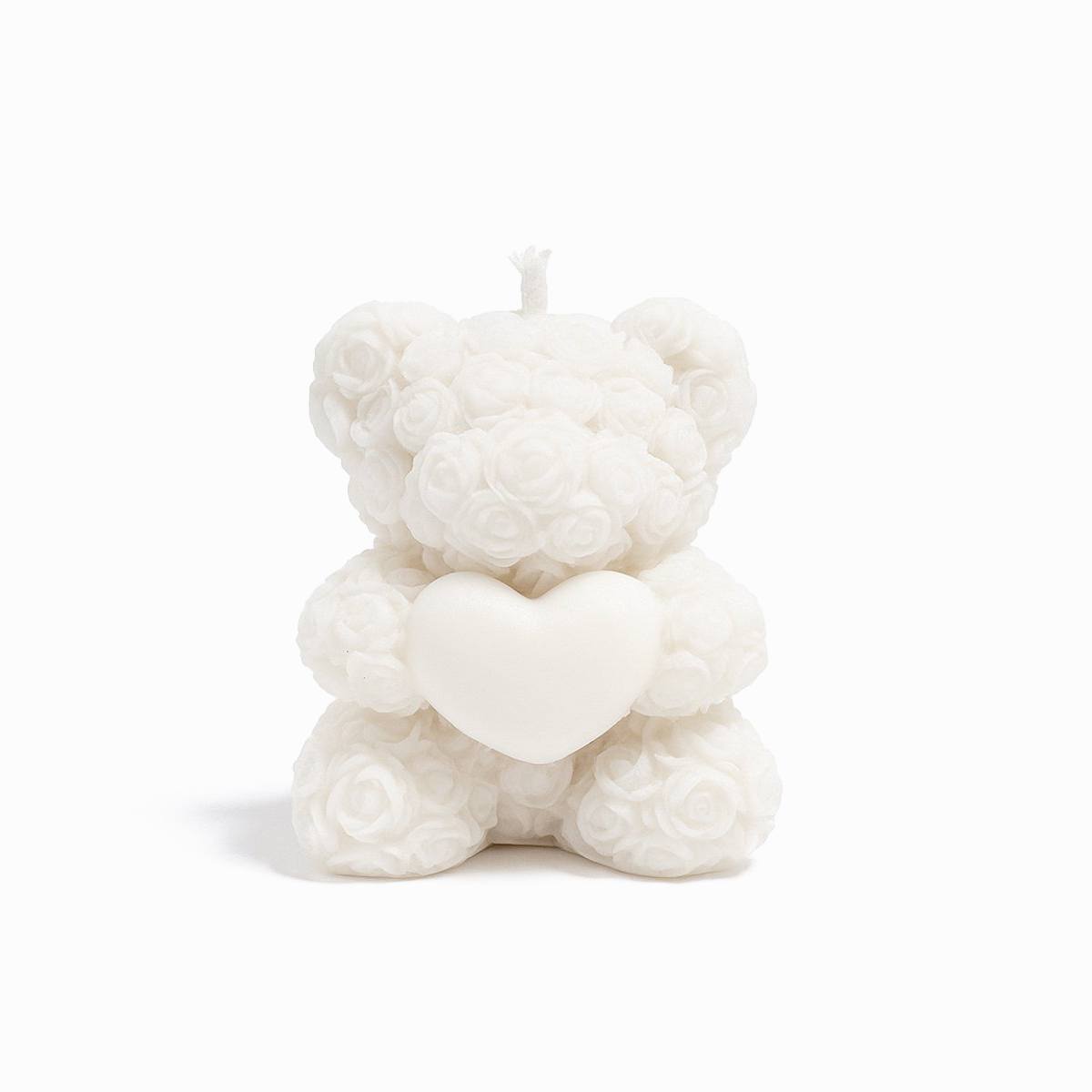 Ky qiri është një kryevepër dekorative që bashkon butësinë e një arushi me elegancën e trëndafilave. I punuar me detaje të imta, ku çdo pjesë e trupit përbëhet nga trëndafila të vegjël të gdhendur me kujdes, dhe me një zemër të bardhë në mes, ky qiri është simbol i dashurisë dhe ngrohtësisë.