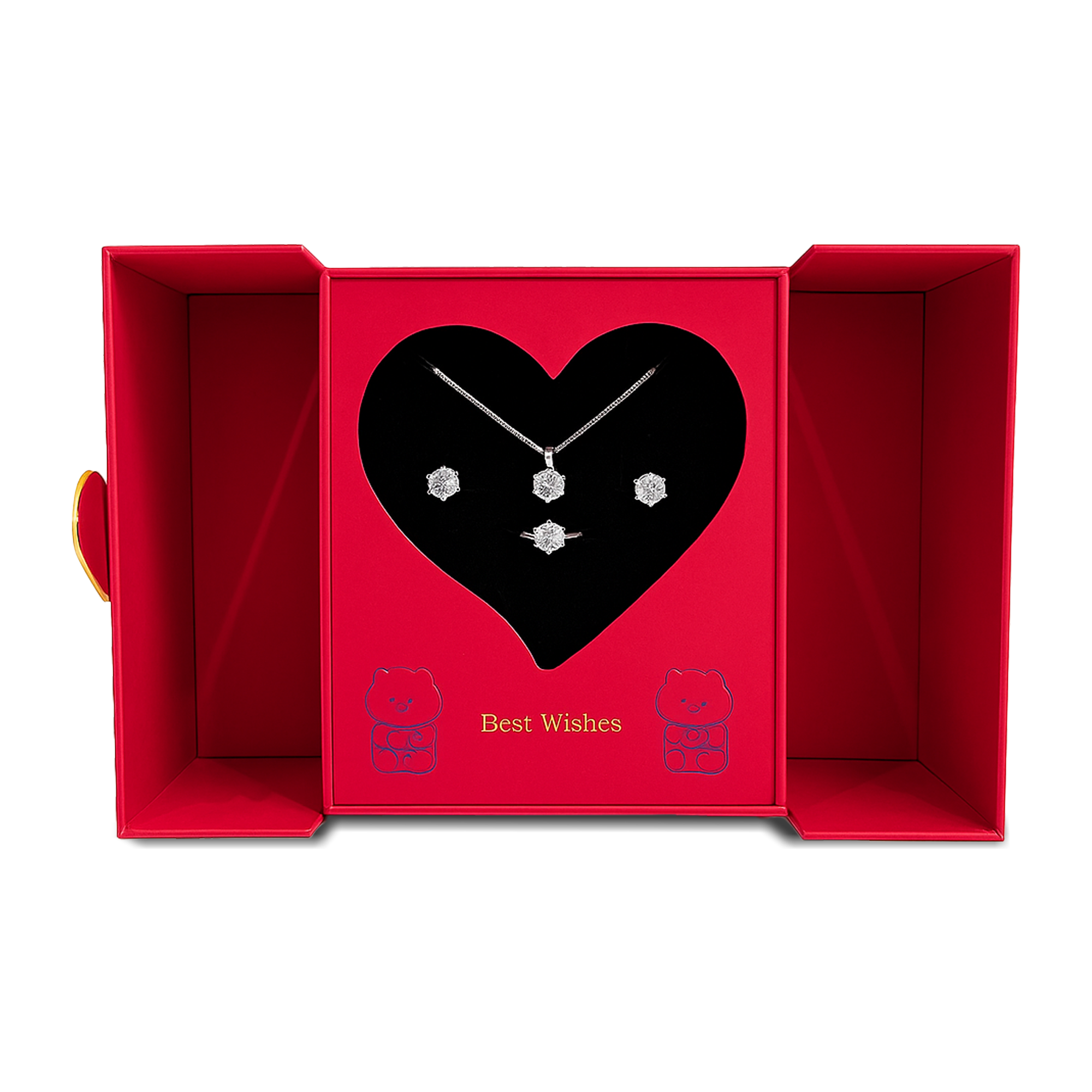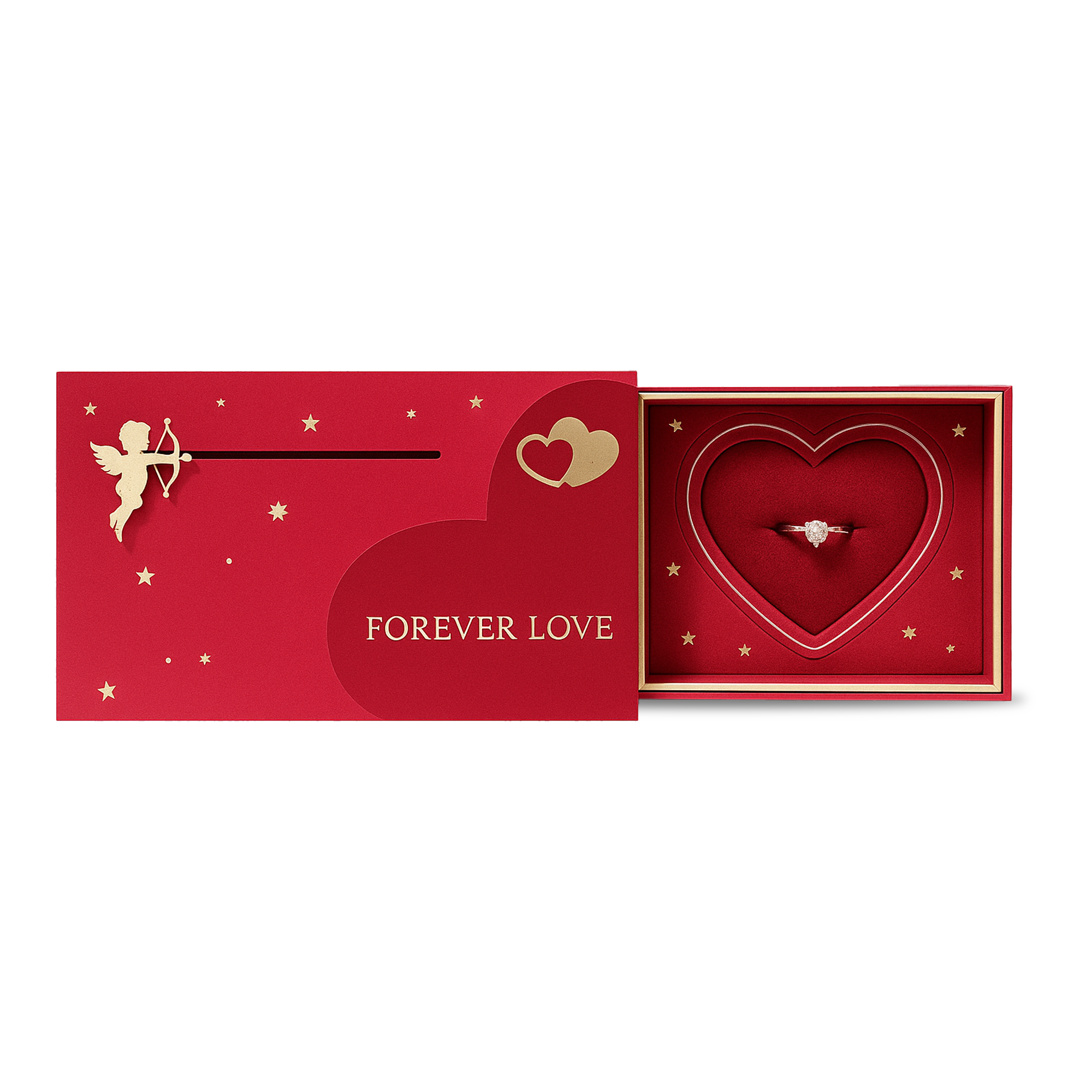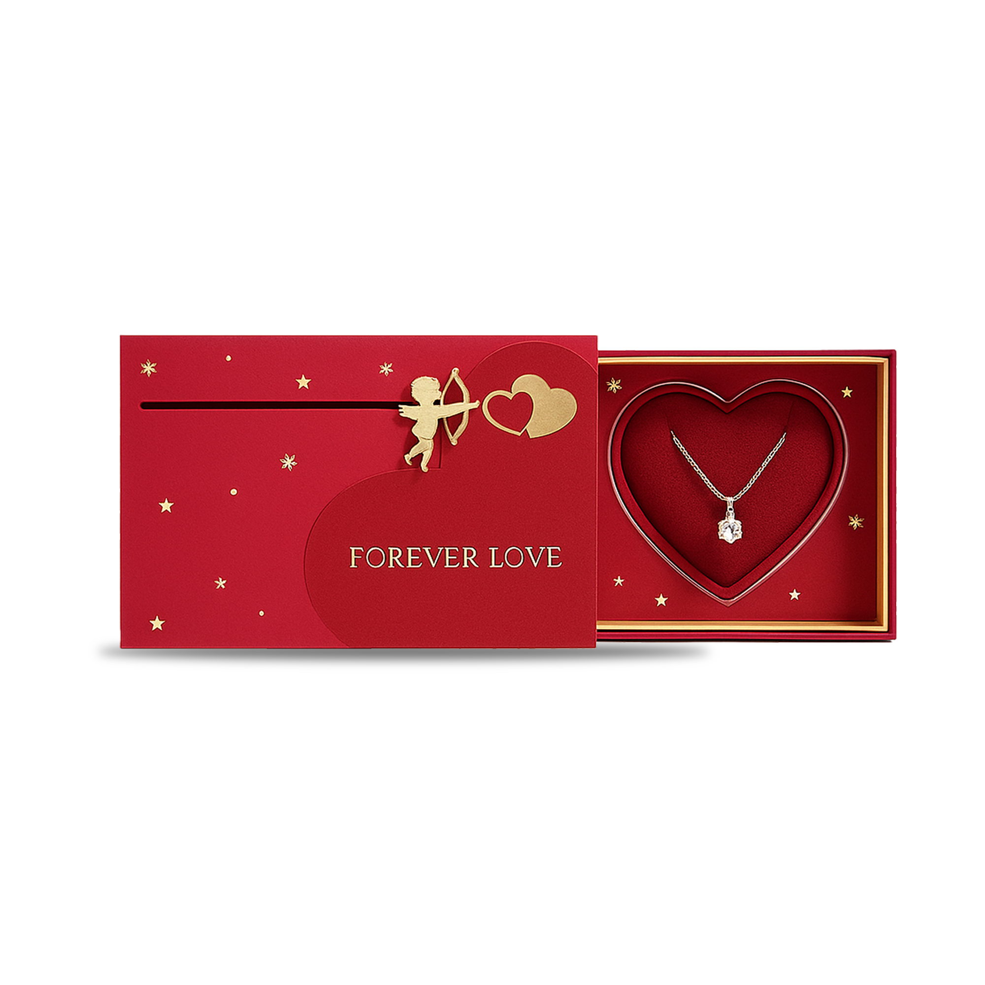 Kjo kuti luksoze “Forever Love” është dizajnuar me kujdes për të përfaqësuar dashurinë në formën më të bukur. Me ngjyrë të kuqe pasionante dhe detaje ari, kutia ka një mekanizëm tërheqës që hapet me një lëvizje delikate për të zbuluar brendësinë e saj në formë zemre.