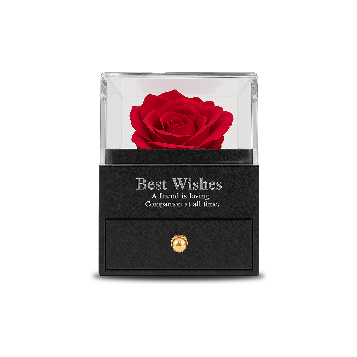 Kjo kuti dekorative me trëndafil të kuq është dizajnuar për të sjellë një prekje luksoze dhe emocionale në çdo ambient. Ajo përcjell ndjenja mirënjohjeje, dashurie dhe miqësie. Dizajni me sirtar të vogël e bën atë të përshtatshme për ruajtjen e bizhuterive apo aksesorëve të vegjël.