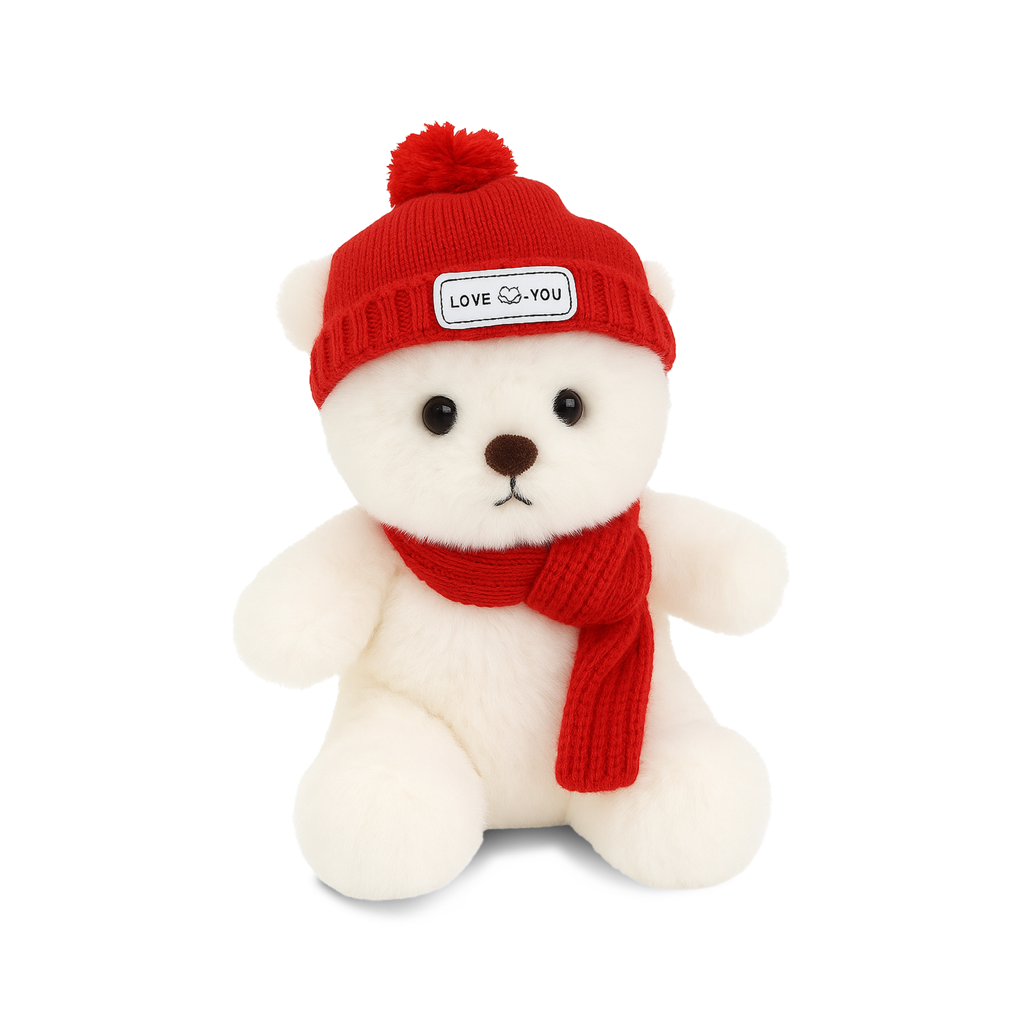 Arush plushe super i butë dhe i ëmbël, i veshur me kapelë dhe shall të kuq me mbishkrimin LOVE YOU. Një dhuratë ideale për ditën e të dashuruarve, ditëlindje apo thjesht për të shprehur dashuri e kujdes.