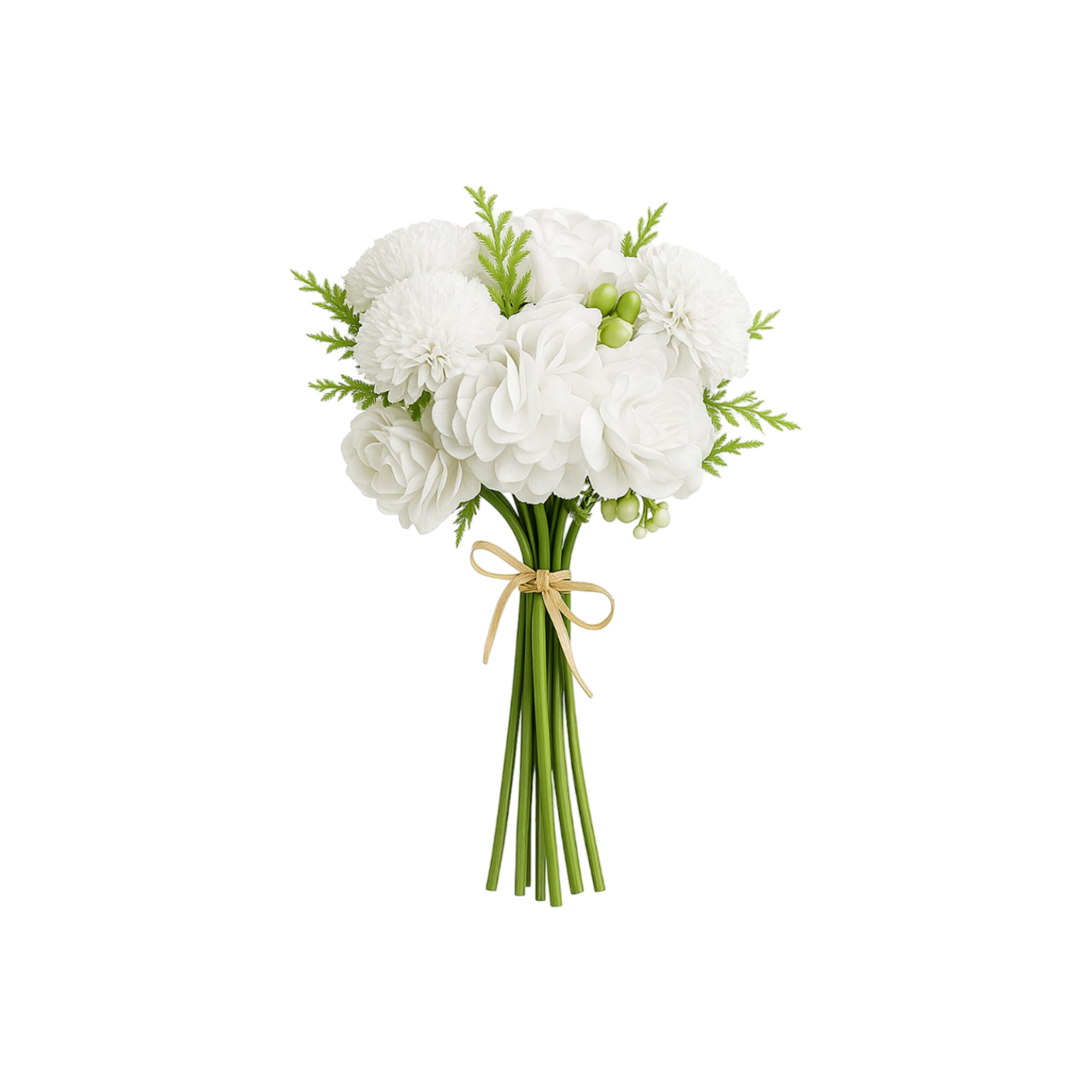 Sillni elegancë dhe pastërti në çdo ambient me këtë tufë lulesh artificiale të bardha, e përkryer për dasma, dekorime tavoline apo ambiente shtëpiake. Kjo tufë përfshin lule të punuara me detaje delikate, gjethe jeshile natyrale dhe një fjongo të thurur për një prekje elegante.