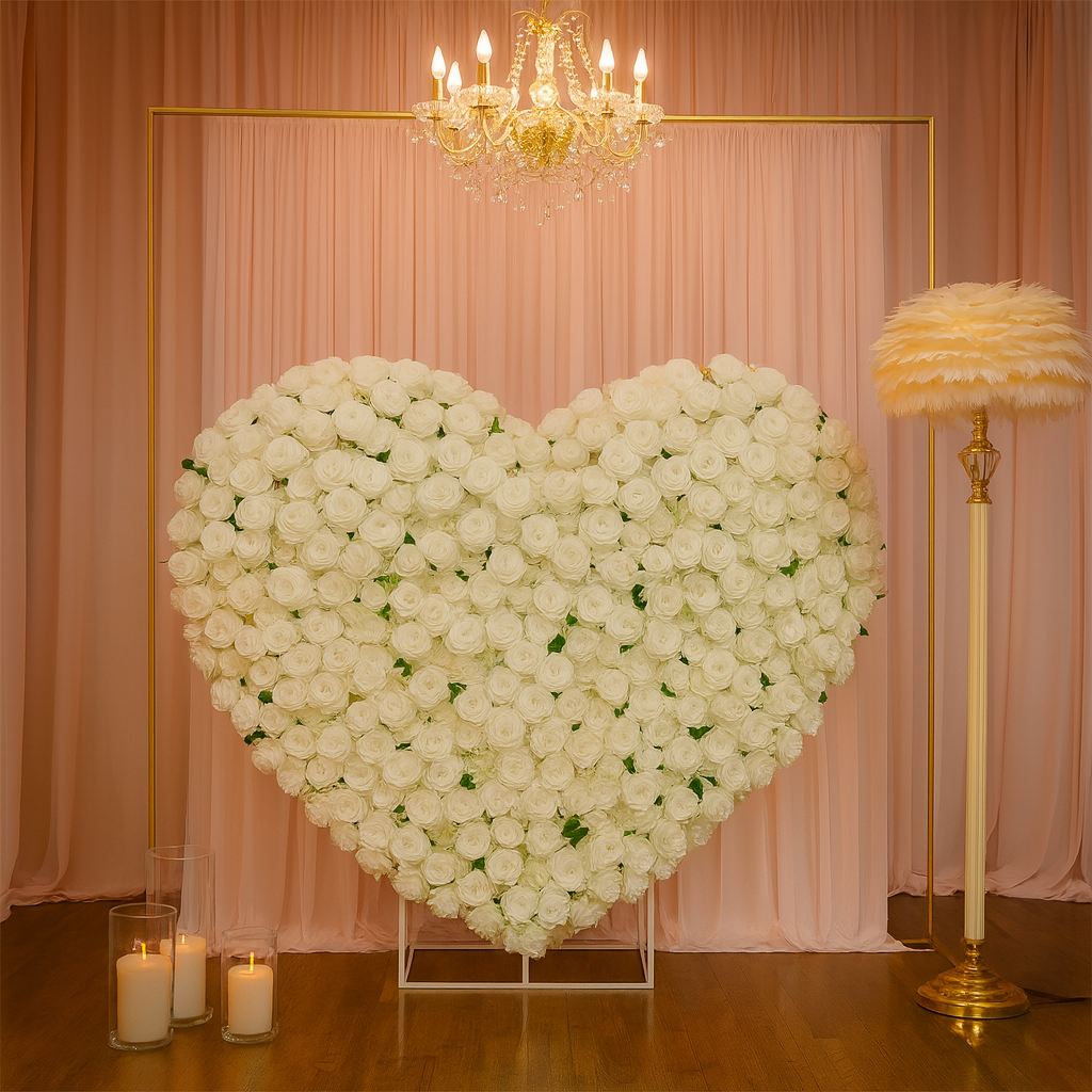 Ky panel spektakolar dekorativ në formë zemre është i mbushur plotësisht me trëndafila të bardhë të cilësisë së lartë, duke krijuar një pamje elegante, të pastër dhe jashtëzakonisht tërheqëse. Me përmasa mbresëlënëse 2.30 metra lartësi dhe 2.60 metra gjerësi, ky dekor është perfekt për evente që kërkojnë një qendër të veçantë vizuale.