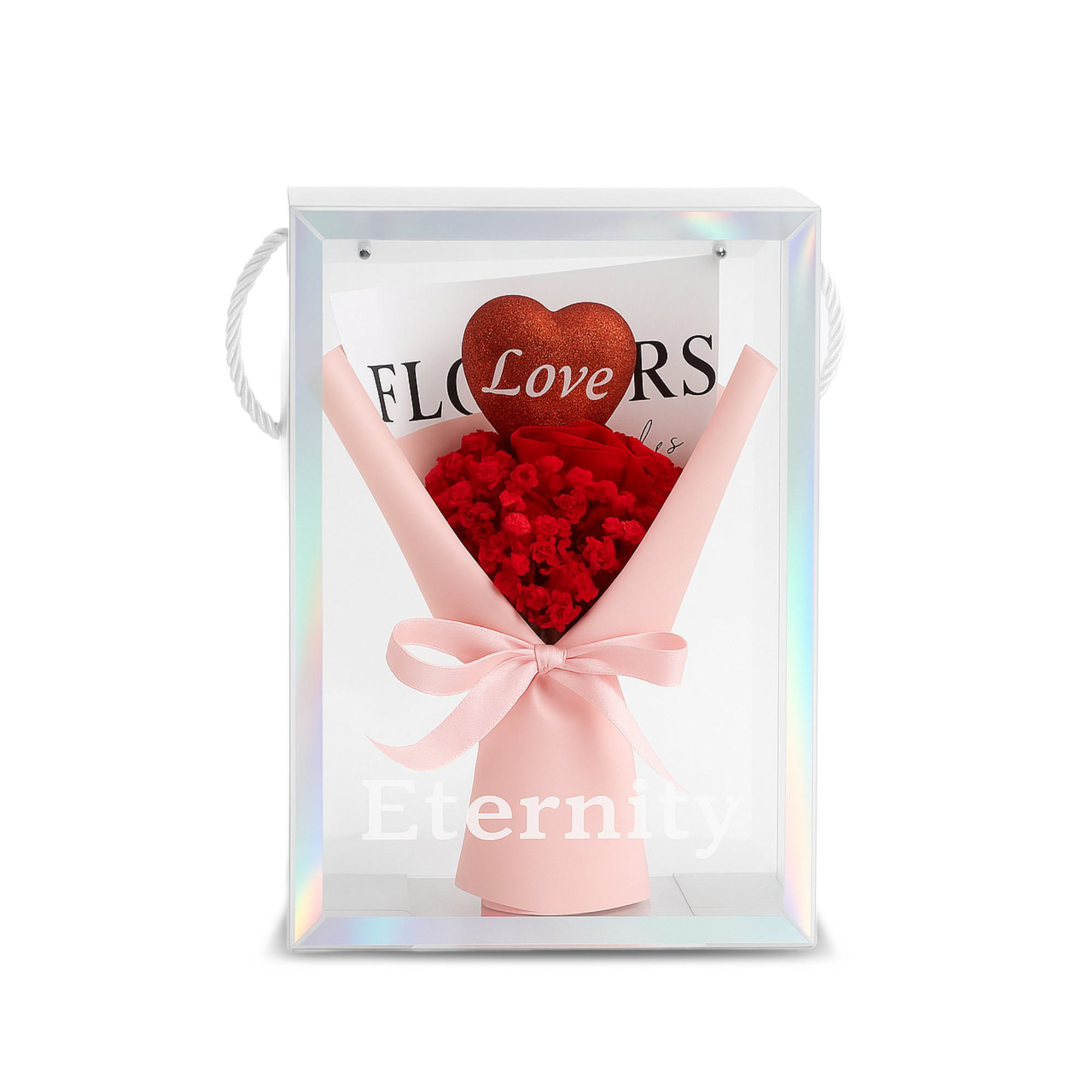 Kutie dhuratë elegante “Eternity” me buqetë lulesh të thara dhe zemër “Love”. Një dhuratë e ëmbël dhe delikate, perfekte për Shën Valentin, përvjetor, ditëlindje ose shprehje dashurie.
