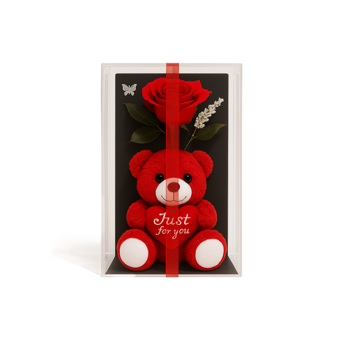 Kjo dhuratë e veçantë përfshin një arush të butë dhe të dashur që mban në duar një zemër të kuqe me mbishkrimin “Just for You”, bashkë me një trëndafil të kuq artificial të punuar me kujdes, vendosur në një kuti transparente me fjongo dekorative.