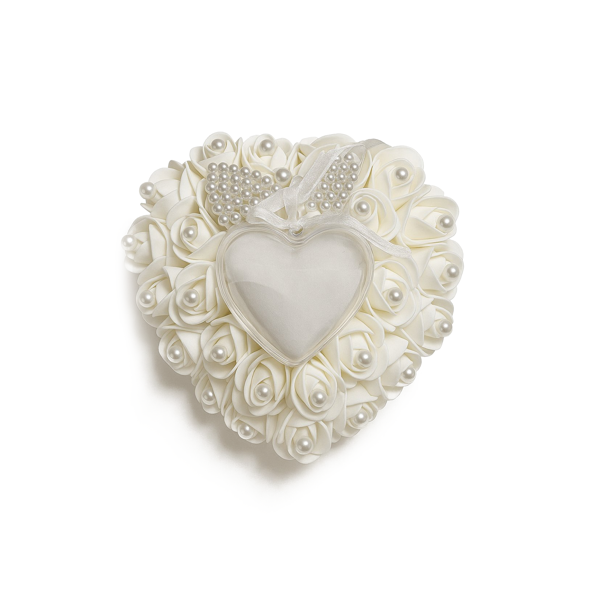 Dekor romantik në formë zemre me trëndafila të bardhë dhe detaje perlash, ideal për dasma, dhurata dashurie apo dekorim shtëpie me stil luksoz.