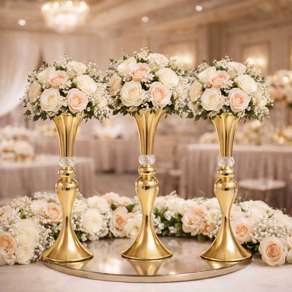 Vazo elegante dekorative me përfundim ari dhe detaj kristali transparent. Perfekte për evente, dasma, dekorime shtëpie apo ekspozime florale me stil të sofistikuar.