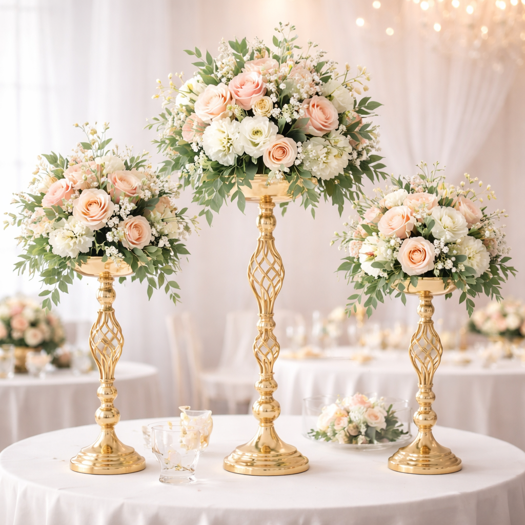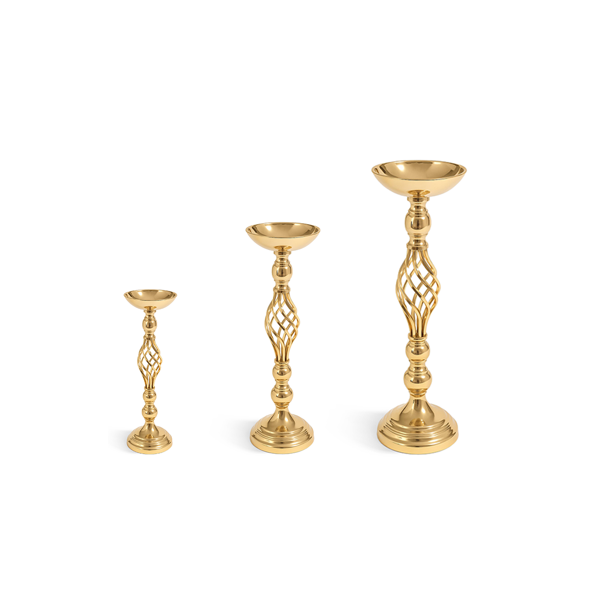 Shtoni një prekje luksi dhe elegance në ambientin tuaj me këtë mbajtëse të artë dekorative. E punuar me detaje të rafinuara dhe shkëlqim metalik, kjo pjesë është perfekte për dekorime dasmash, evente, tavolina banketesh apo ambiente shtëpie.