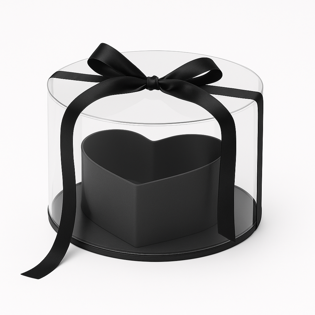 E punuar me kujdes nga materiale cilësore, kjo kuti kombinon kapakun transparent akrilik, bazën dhe zemrën e zezë mat, si dhe fjongon e zezë sateni, duke krijuar një pamje moderne, të rafinuar dhe perfekte për çdo rast special.