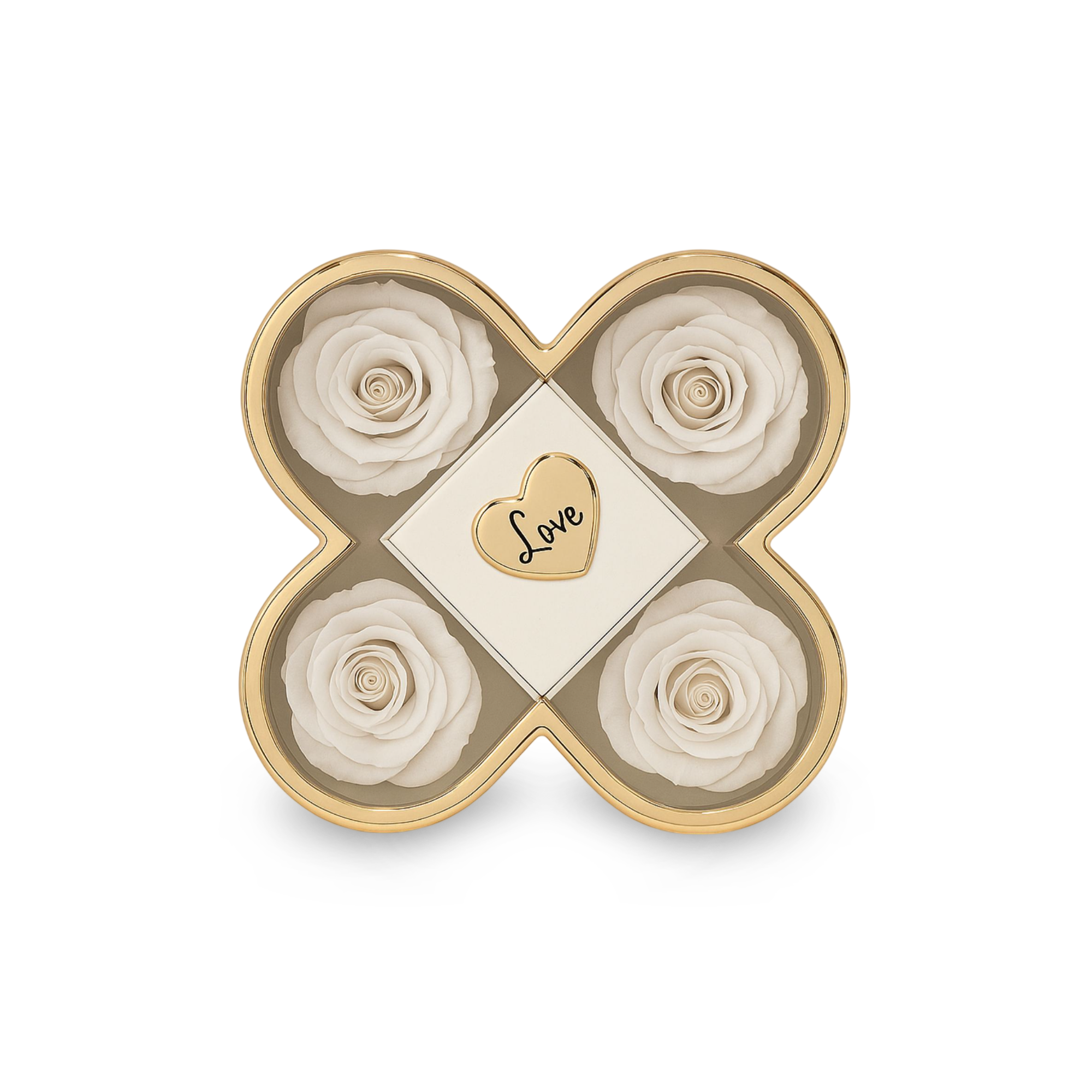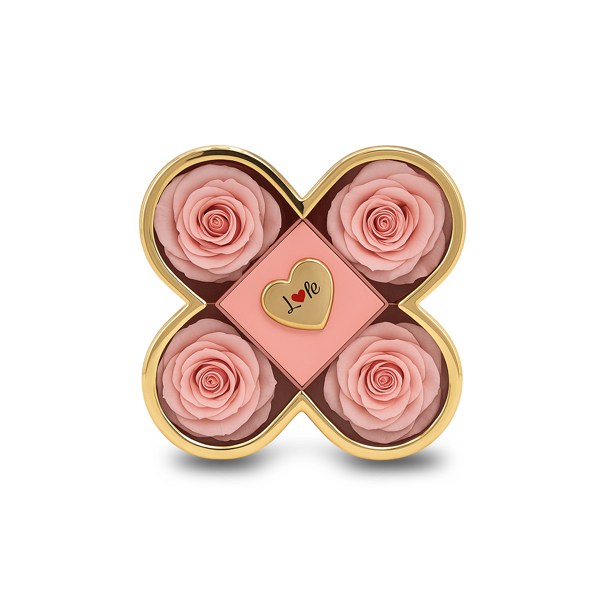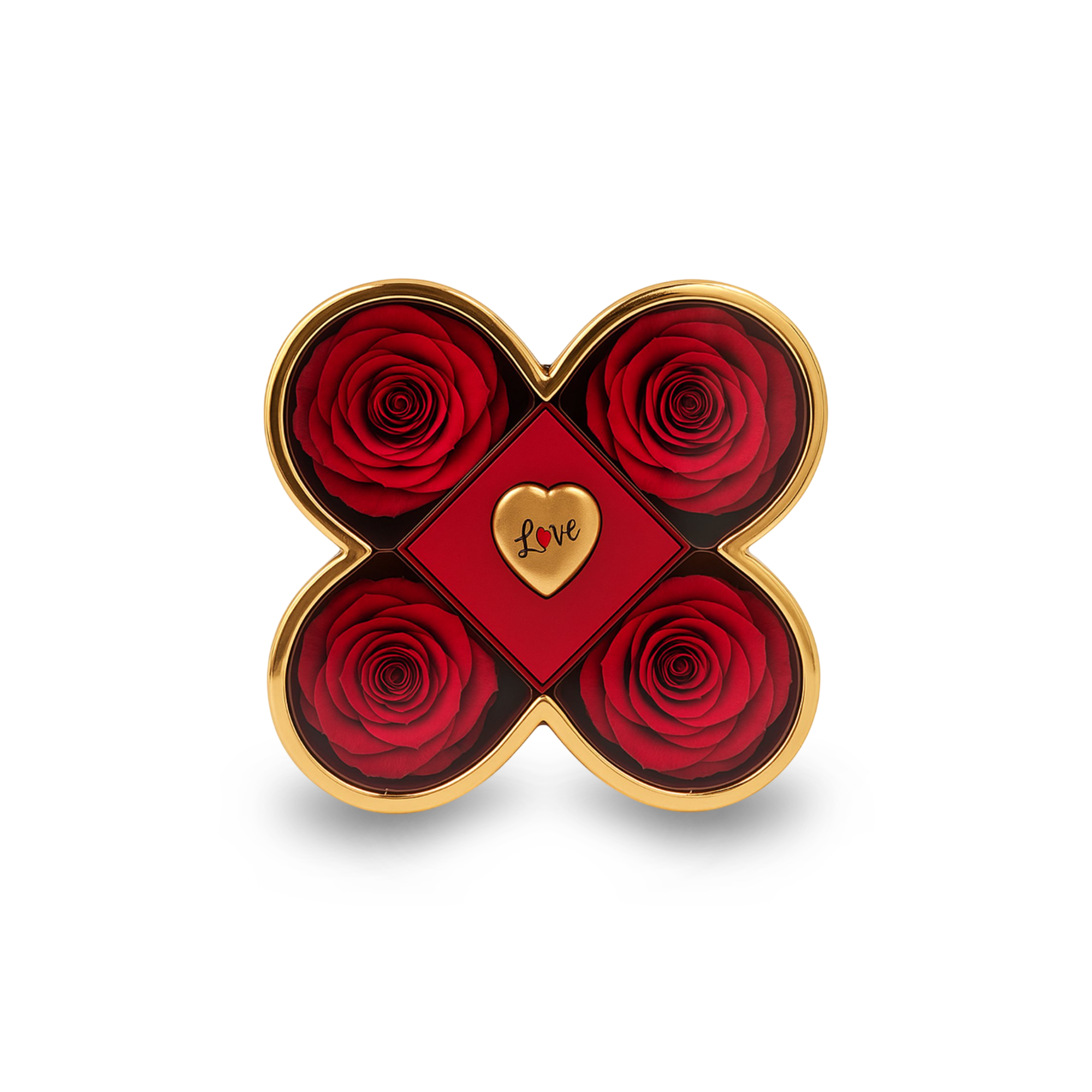 Një kombinim perfekt i romancës, elegancës dhe luksit, kjo kuti dhurate në formë elegante përmban 4 trëndafila të kuq artificialë me pamje shumë realiste, të vendosur në mënyrë simetrike, si dhe një kuti qendrore të hapshme, ideale për unazë, bizhuteri ose surprizë speciale.